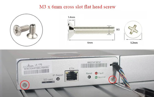 The Antminer screw set includes M3×6mm flat head screws specially designed for securely fixing the miner. These screws help protect your device from dust, particles, and external damage.